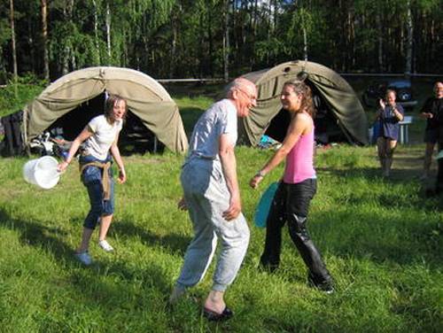 Jak to po zdanym egzaminie odbyło się "bolesne dla pupy" pasowanie na stopnie nurkowe. Dostali sprawiedliwie zarówno jedno-, dwu- jak i trzygwiazdkowcy. Instruktorów i starszych stopniem kolegów, pomagających w szkoleniu i "biciu" czekała w odwecie kąpiel w jeziorze.