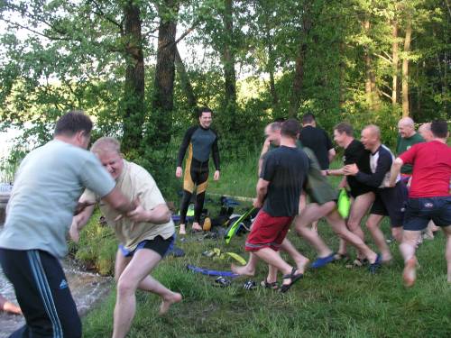 Jak to po zdanym egzaminie odbyło się "bolesne dla pupy" pasowanie na stopnie nurkowe. Dostali sprawiedliwie zarówno jedno-, dwu- jak i trzygwiazdkowcy. Było co podziwiać, zwłaszcza wypięte i czerwone od przyjętych płetwą klapów pupy. Zabawa była przednia i nikt nie poczuł się urażony, że za mało dostał.