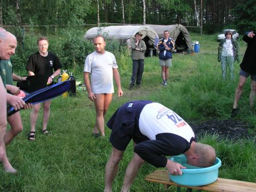 Jak to po zdanym egzaminie odbyło się "bolesne dla pupy" pasowanie na stopnie nurkowe. Dostali sprawiedliwie zarówno jedno-, dwu- jak i trzygwiazdkowcy. Było co podziwiać, zwłaszcza wypięte i czerwone od przyjętych płetwą klapów pupy. Zabawa była przednia i nikt nie poczuł się urażony, że za mało dostał.