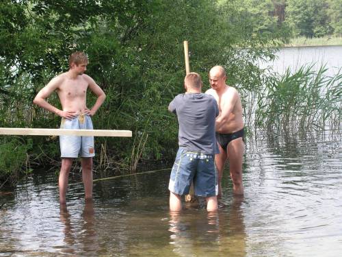 Niestety po sezonie zimowym "zniknął" pomost, który całe lata służył korzystającym z plaży. Z inicjatywy i przy głównym udziale członków klubu gwardyjskiego powstał nowy wspaniały pomost, a więc obozowiczowie zostawili coś po sobie i wcale nie były to śmieci. Bardzo dobre dechy i pale na wybudowanie tego pomostu dostarczył tutejszy pan leśniczy.