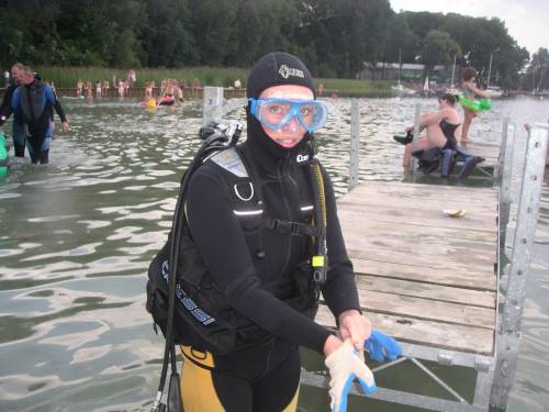 Ponieważ widoczność pod wodą była słaba, nie było sensu robić takich zdjęć. Tym razem pare fotek przedstawiających nurków już na powierzchni. Co niektórzy byli asekurowani przez dzielnego ratownika Anię (w naturalnej piance ze skóry z opalenizną).