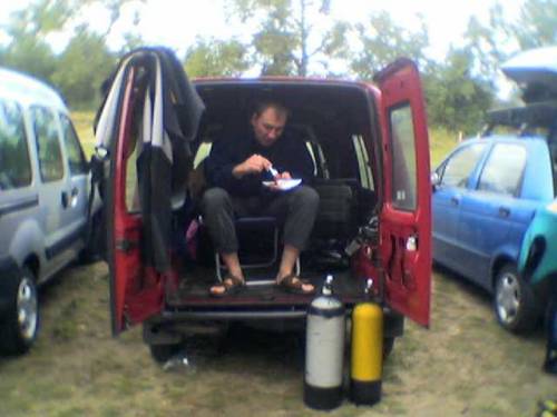 A oto różne fotki z naszego nurkowania. Wykonane oczywiście na lądzie. Nurkowaniu towarzyszyła miła atmosfera przy glilu. Nawet aura, zaczął padać deszcz, nie była w stanie popsuć naszych humorów. Z radości odtańczyliśmy jezioro łabędzie i przedstawiliśmy grupowo symbol naszego klubu tj. znak PERKOZA. Zwijanie pontonu odbyło się już w strugach ulewnego deszczu.