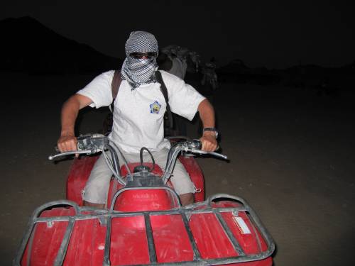 Oprócz safari nurkowego zafundowaliśmy sobie wycieczkę na QUADACH w głąb pustyni, do beduińskiej wioski. Jazda była przednia. Ci co jeszcze nie widzieli mogli obejrzeć sposób życia Beduinów. Nie obyło się bez jazdy na wielbłądach. Powrót odbywał się już po zmroku, czyli odbyliśmy nocną jazdę przez pustynię. Każdemu kto lubi troszkę adrenaliny proponuję skorzystać z takiej jazdy quadami podczas pobytu w Egipcie. Pozostawia to niezapomniane wrażenia.