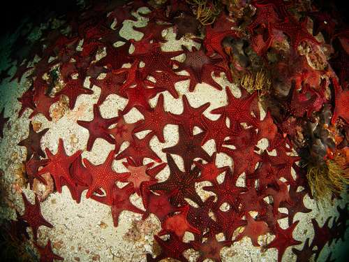 Nurkowania na Galapagos były dla mnie głównym celem tej wyprawy. Dużym dla mnie zaskoczeniem była inność nurkowań odbytych w tym akwenie. Mimo położenia na samym równiku, temperatura wody to tylko maksymalnie 23st.C a bywało, że tylko 17st.C. Silne prądy zmuszały nas do czepiania się skał i niczym na galerii w teatrze oglądaliśmy podwodne przedstawienie. Obok nas, ponad i pod nami, przepływały ogromne stada rekinów galapagoskich (blisko spokrewnionych ze słynnym żarłaczem białym) i rekinów młotów. Spotkaliśmy pod wodą duże ilości morskich żółwi i orleni. Były stada barakud. Widzieliśmy również z bliska manty, raje, lwy morskie i delfiny. Największym jednak dla mnie przeżyciem było pływanie z rekinami wielorybimi. Ich potęga była przytłaczająca i zrobiła na mnie ogromne wrażenie. Oglądaliśmy także ryby kroczące po dnie (jak szminką wymalowane), mureny, kolorowe rozgwiazdy, homary (langusty) i wiele różnych ryb, których nazw nie sposób zapamiętać. W rankingu dotychczasowych moich nurkowań Galapagos zajęło niezaprzeczalnie 1 miejsce.