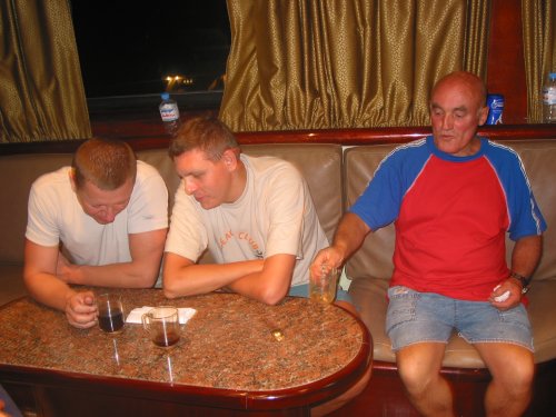 Ten wieczór był szczególny. Załoga przygotowała szczególną niespodziankę, którą była specjalna uroczysta kolacja. Wystarczy popatrzeć na zdjęcia, aby pozazdrościć wspaniałego wieczoru. Przy okazji można zapoznać się z całą załogą statku, która dbała aby niczego nam nie brakowało, no może prawie niczego ......