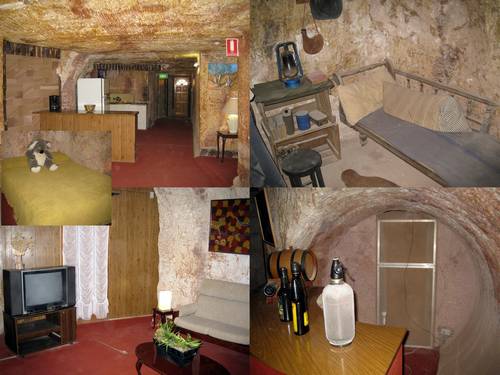 W naszej podróży przez interior odwiedziliśmy miasto Coober Pedy, słynące z kopalni opali. Zwiedzaliśmy kopalnie, muzeum opali, dawne podziemnie mieszkanie górnicze i podziemny kościół, a mieszkaliśmy w podziemnym hotelu. Temperatura pod ziemią jest komfortowa, bo zawsze wynosi ok.24st.C, gdy na zewnątrz potrafi być 40st.C a powietrze jest przy tym bardzo suche. W Coober Pedy można spotkać sporo Aborygenów. W związku z tym w mieście tym oficjalnie panuje półprohibicja, jednak ja tego jakoś nie zauważyłem. Na ogół nie jadam pizzy, ale są sytuacje wyjątkowe ..... :) .