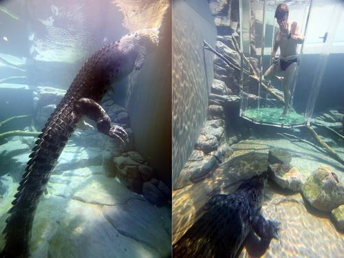 Mało mi było oglądania krokodyli w naturze, więc postanowiłem się z nimi wykąpać. Na wszelki wypadek dałem się zamknąć w klatce z grubych "płaskowników" z pleksi. Największe okazy miały ok. 6m długości i siłę taką, że jak uderzyły w klatkę, to było co poczuć. W klatce pływałem sobie na bezdechu. Wystawała ona lekko nad powierzchnię wody, więc mogłem w każdej chwili zaczerpnąć powietrza, byle nie otwierać jej grawitacyjnie uchylnego włazu, bo mogłoby to skończyć się dla mnie nieprzyjemnie. Na terenie tego niezwykłego zoo były również bardziej sympatyczne zwierzęta: różne jaszczurki, węże (w tym w trakcie konsumpcji myszki), zielone żabki itp. Było fajnie!