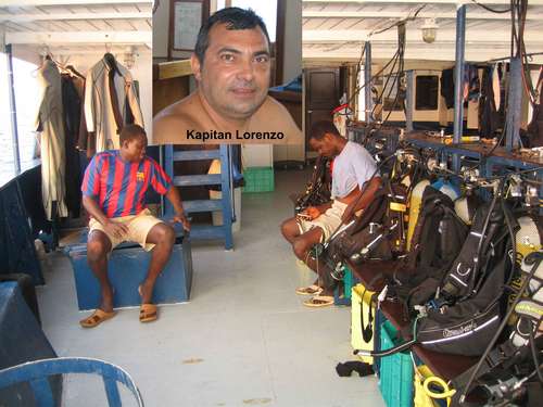 Naszym domem na czas wyprawy był pełnomorski statek Don Questo. Pływa on pod włoską banderą i dowodzony jest przez włocha - kapitana Lorenzo. Dobrze dostosowany do potrzeb nurkowych, gwarantował nam powietrze zawsze na czas, a robiliśmy po 3 nurki dziennie i parę razy czwartego nurka nocnego. Wygodną platformą byliśmy wraz z Zodiakiem i ekwipunkiem opuszczani na wodę i z niej podejmowani. Kajuty gwarantowały wygodny odpoczynek a sudański kucharz serwował urozmaicone posiłki, wzbogacając nasz jadłospis rówież o to co złowiliśmy na wędkę. Cała załoga to sudańczycy i małe sympatyczne ptaszki, przyzwyczajone do bliskiej obecności człowieka.