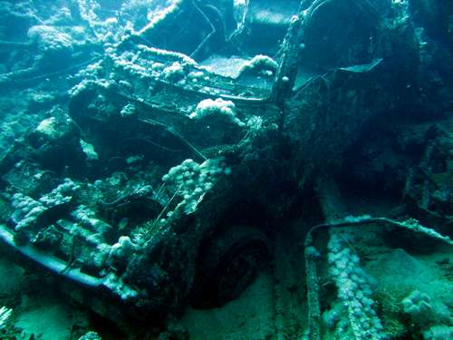 Podczas naszych nurkowań specjalną atrakcją były podwodne wraki statków, w tym statku handlowego przewożącego samochody Toyota. Mogliśmy go dość dobrze spenetrować i "usiąść" za kierownicą samochodu.