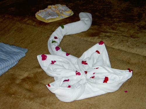 Tak wyglądał nasz hotel w DAHAB. Całkiem przyjemny z pokaźnym basenem. Po każdym sprzątaniu pokoju zastawaliśmy fantacyjnie ułożone przez pokojowych ręczniki. Na suficie można było dojrzeć "pięknego" dużego pająka.